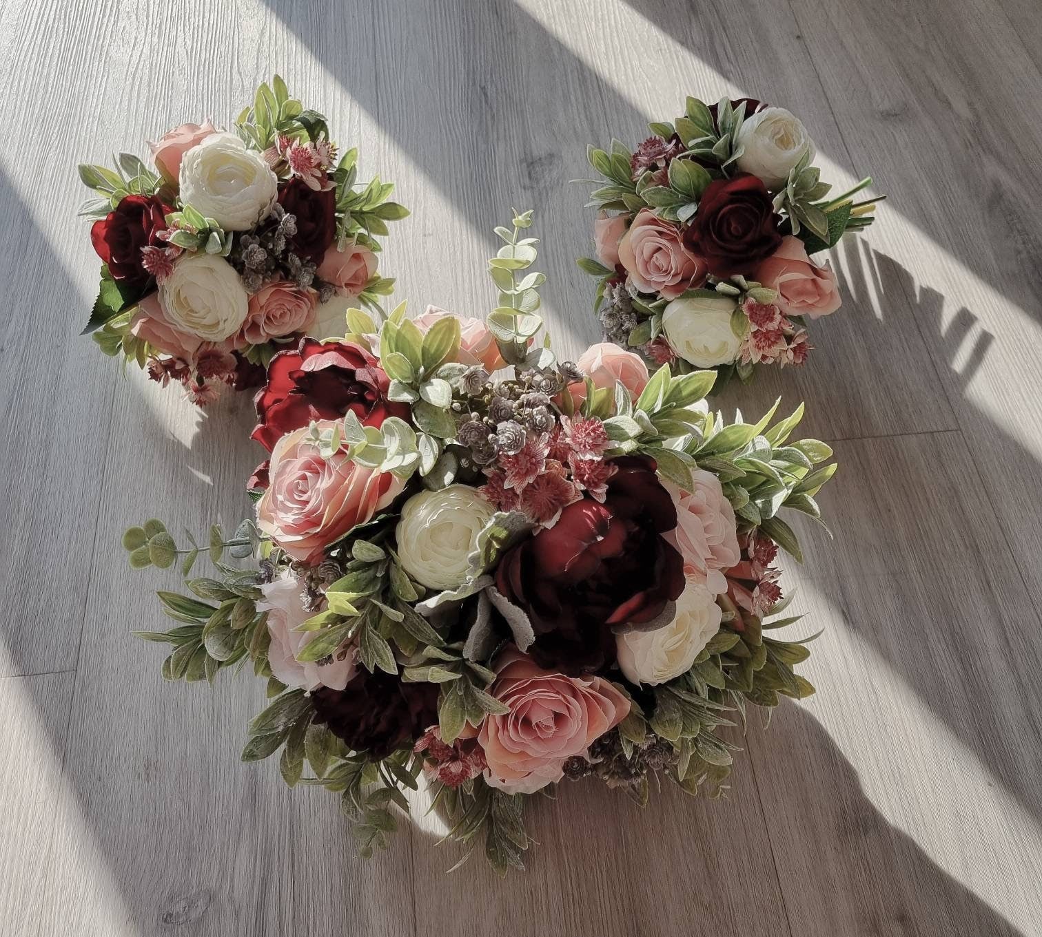 Burgundy, ivory, dusty pink, grey & muted greenery artificial wedding bouquet