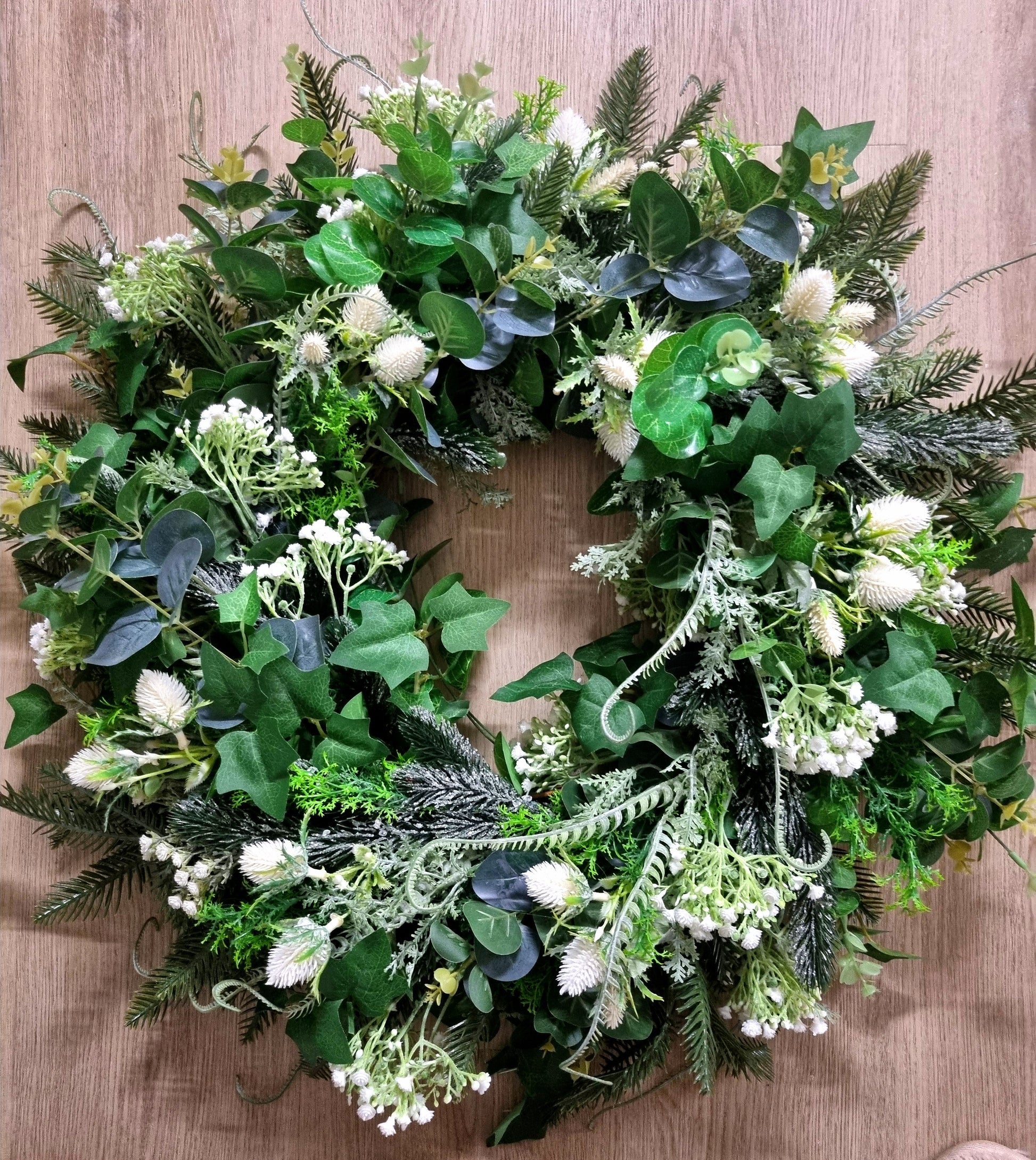 A stunning gathering of everlasting lush festive foliage go to create this gorgeous faux christmas wreath that will see you through the winter months.